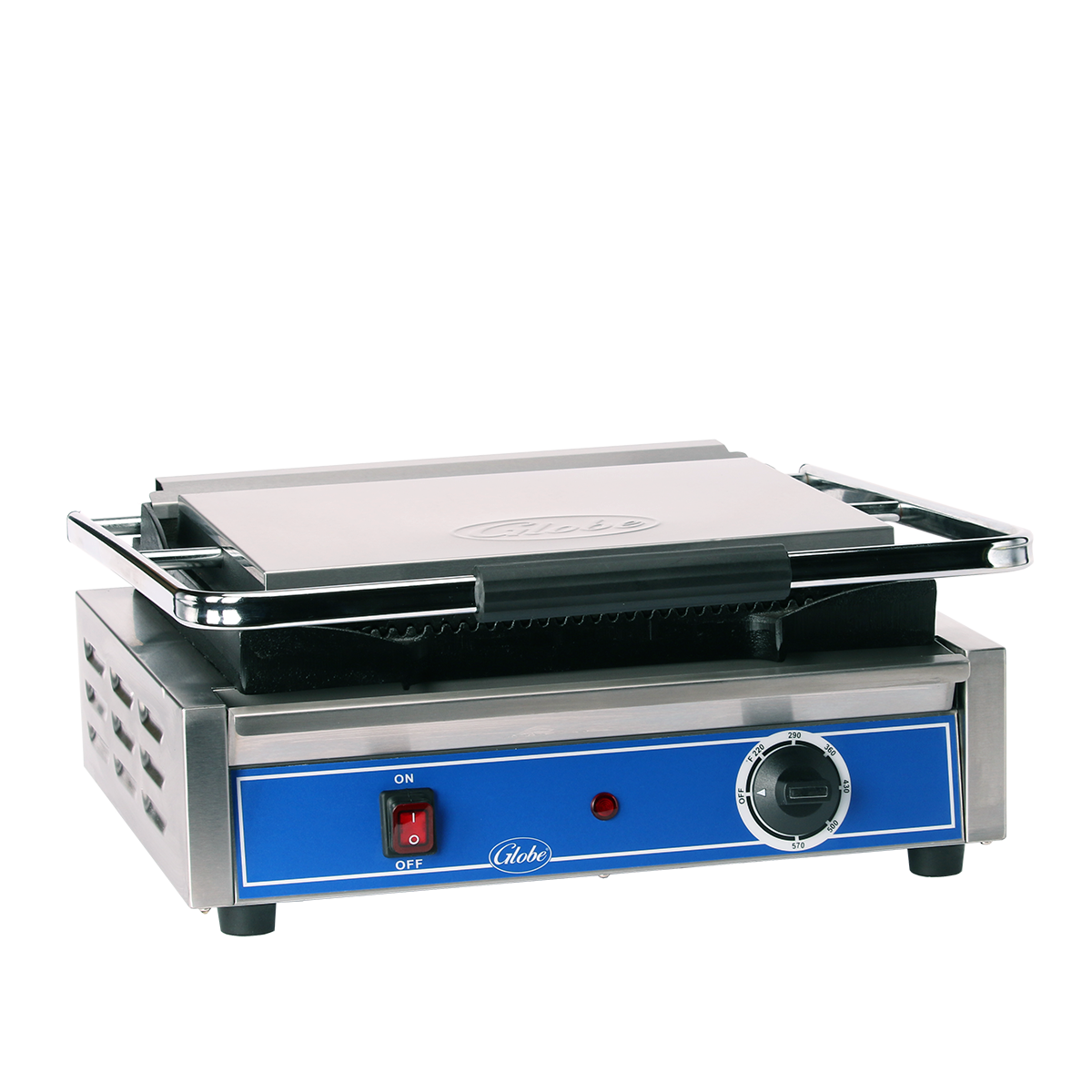 Globe's GPG1410 is a mid-sized panini grill great for Reubens, Philly steak, panini/sandwiches, ham & cheese, Cubans, quesadillas, burritos, vegetables, variety of meat or chicken. The low-profile (7.5" high), ergonomic design, and grooved top and bottom plates, make this mid-size grill large on cooking options!