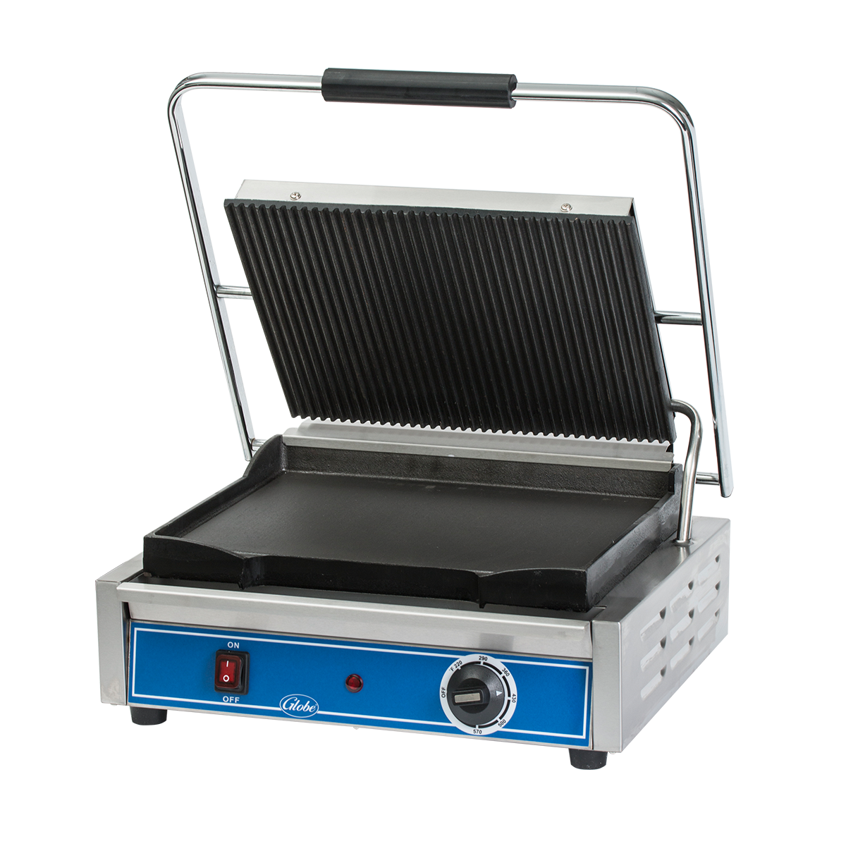 Globe's GPGS1410 is a mid-sized panini grill great for Reubens, Philly steak, panini/sandwiches, ham & cheese, Cubans, quesadillas, burritos, vegetables, variety of meat or chicken. The low-profile (7.5" high), ergonomic design, and grooved top and bottom plates, make this mid-size grill large on cooking options!