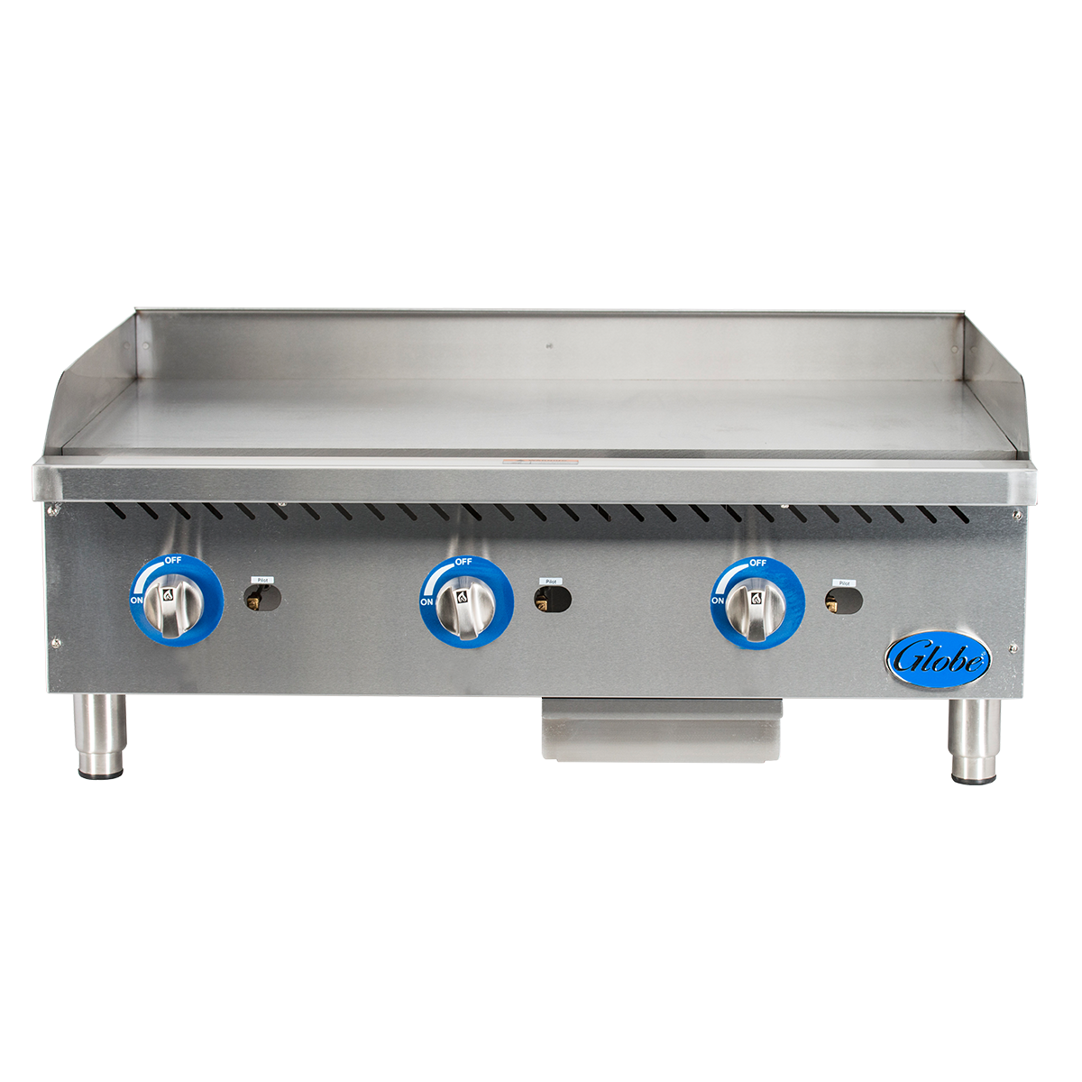 Whether you're cooking a lot of the same thing or a wide array of items at once, Globe's GG36G gas griddles are the best choice. thanks to the energy efficient insulation and evenly heated cooktops. The 1" thick stainless-steel griddle plate and 30,000 BTU U-style burners mean no dead zones or hot spots, so food is cooked evenly across the surface.
