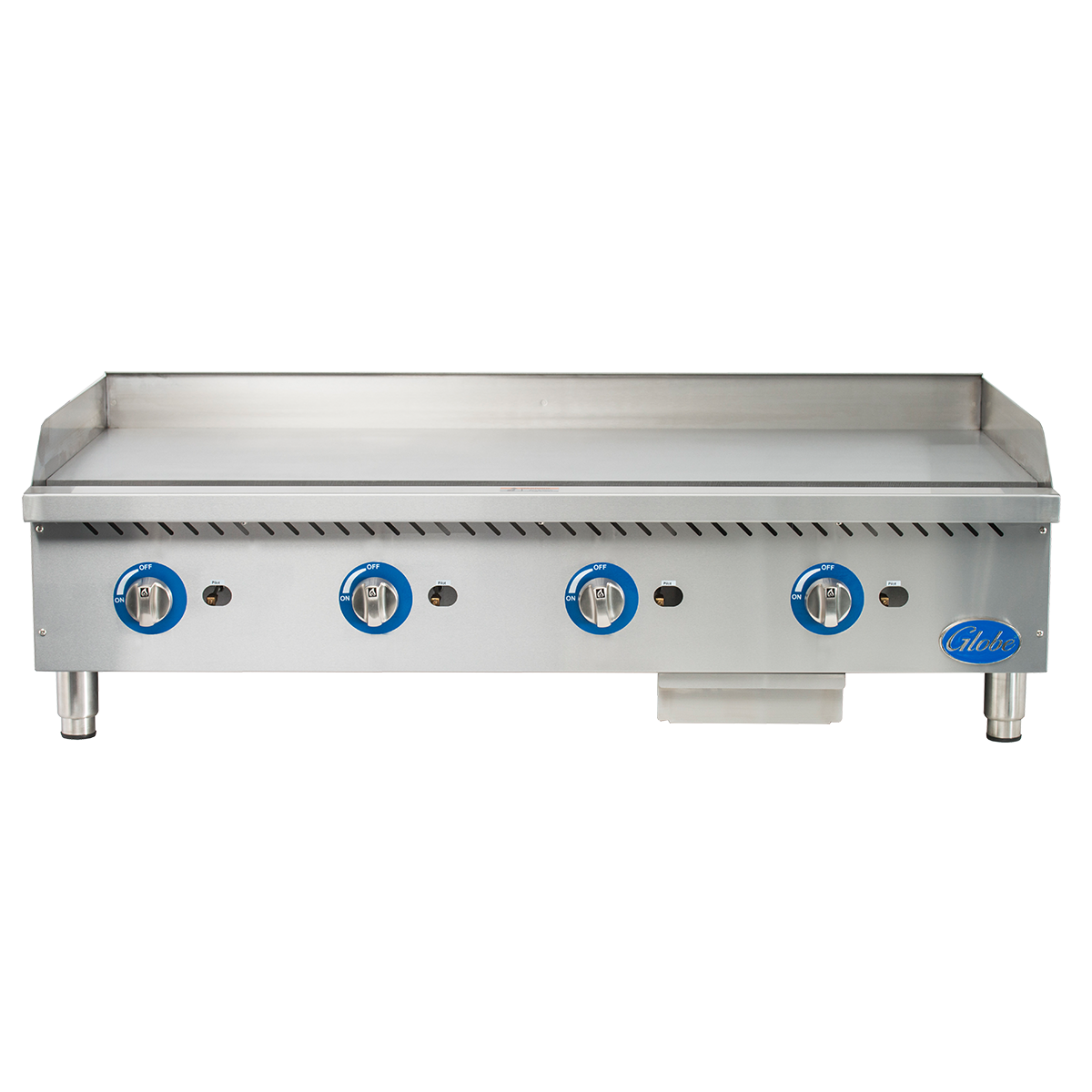 Whether you're cooking a lot of the same thing or a wide array of items at once, Globe's GG48G gas griddles are the best choice. thanks to the energy efficient insulation and evenly heated cooktops. The 1" thick stainless-steel griddle plate and 30,000 BTU U-style burners mean no dead zones or hot spots so food is cooked evenly across the surface.